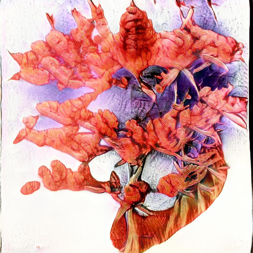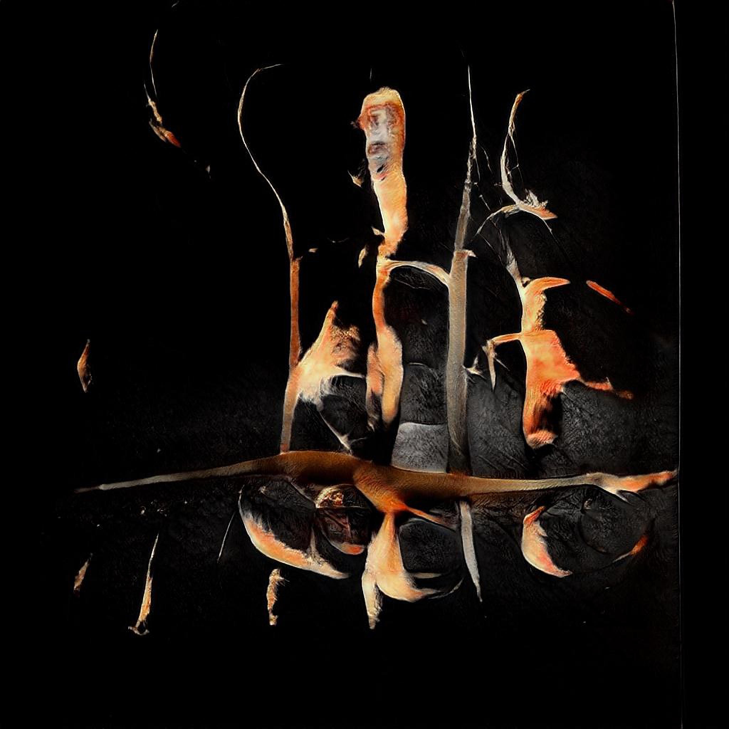 Here are four images of my own, from some experiments in 2019-2020. This is the output of a highly dis-correlated dataset: the images in the training data were incredibly diverse, though tended toward flowers and images of dancers (reflections of the public domain material I was using in more direct digital collages at the time).