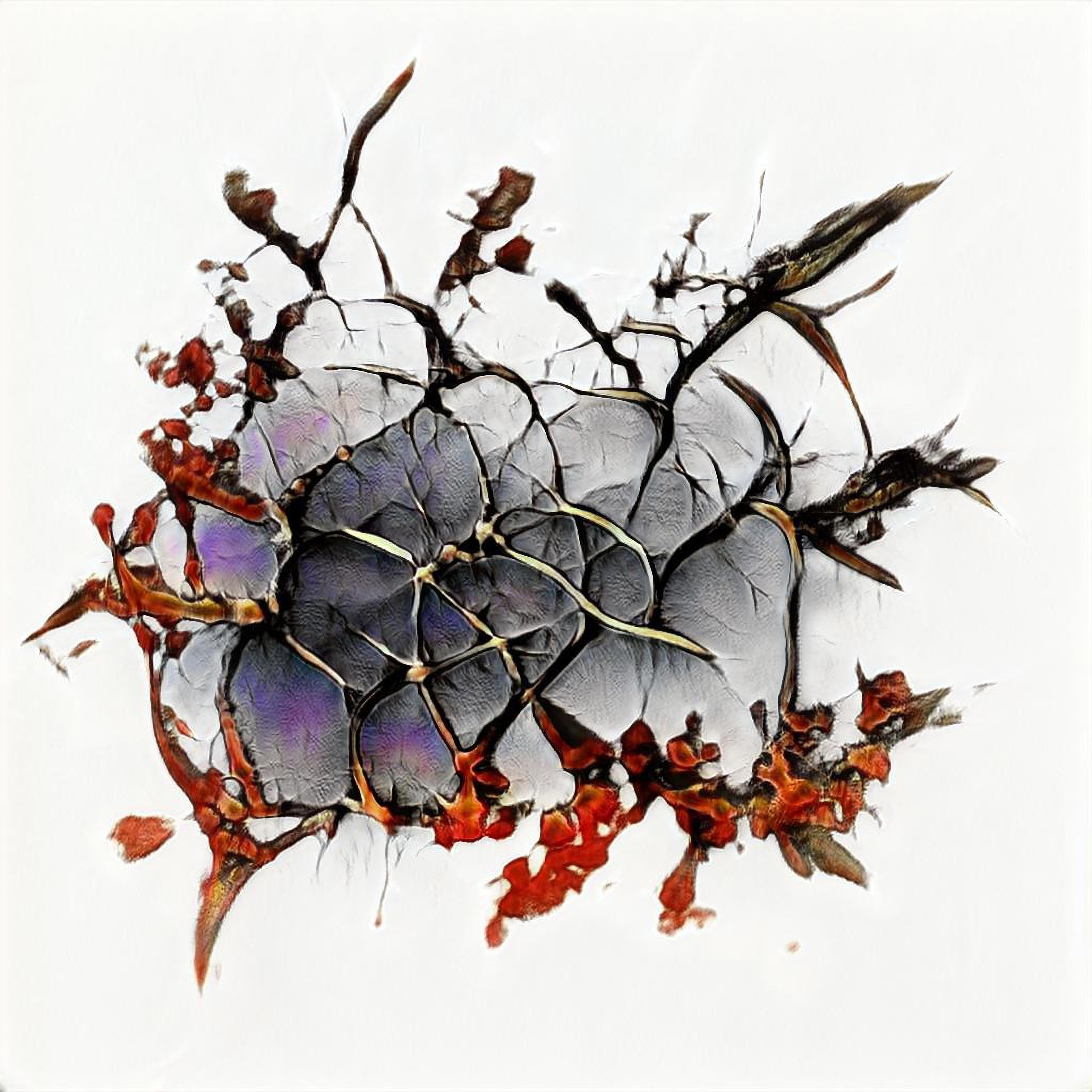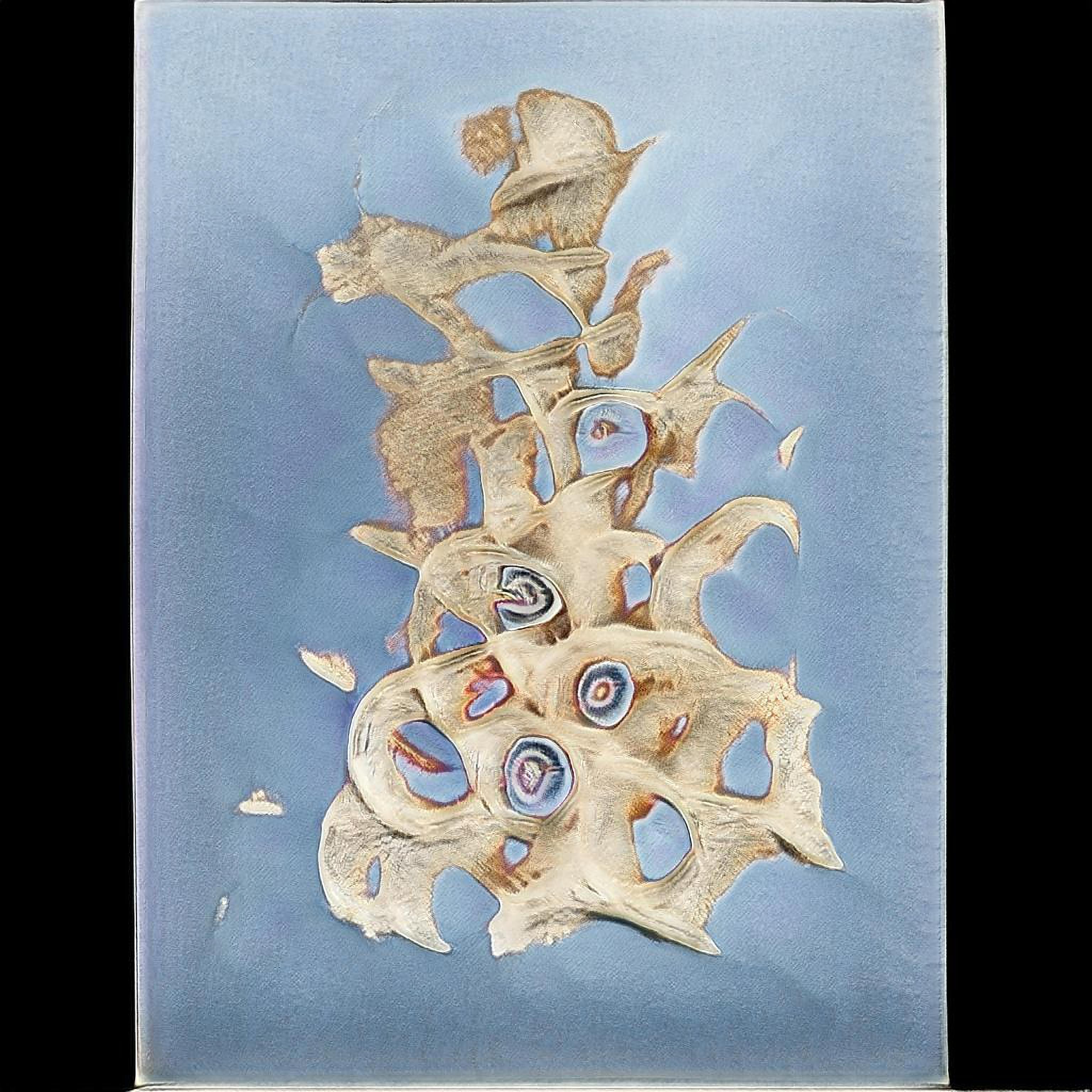 They start out with a jpg of random noise and seek paths through adjacent pixels in the fuzz, a highly detailed game of connecting the dots. They correlate these patterns to a kind of visual dictionary of possible sequences. As those lines form the bare outline of a desired shape, it fills in more detailed information. More iterations, more layers; more detail. This search for meaningful neighbors in the pixels forms a meandering line, like the hyphae of a mycelial network under soil, looking to move in directions guided by nutrients. Aside from emptiness, the line is the simplest pattern. Lines touching lines is next. The pixel streaks can be interpreted as a method of connection between loosely associated clusters of pixels, a response to the barest presence of information. When they don’t find more complexity, they would be drawn as if it was a wandering pen. Blobs, meanwhile, are the opposite: a pileup of streaks, clumped like oil paints until textures emerge. These textures are refined and built up over the course of generating layers of detail.