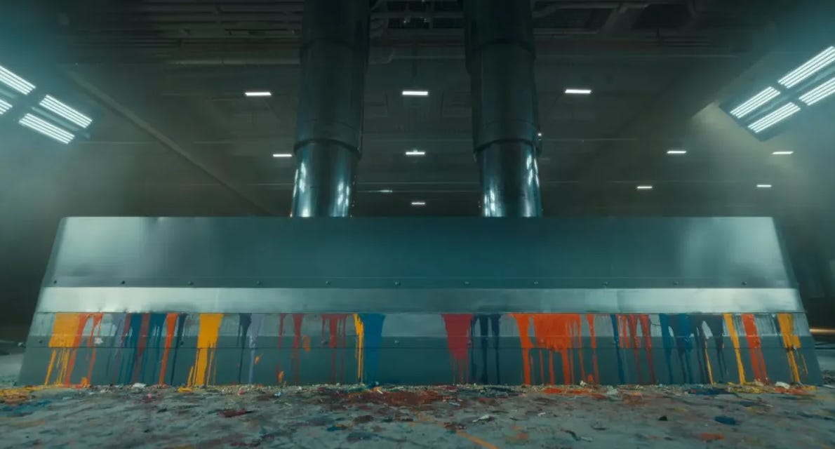 We then crush cans of paint over a piano, a metronome, a clay sculpture, a series of camera lenses, a guitar. A pile of notebooks explodes, and then a wood model used for posing humans is bent over backward. The slab lands, purely flat on its pedestal, as nothing but paints bleeds from its edges. The song returns: “Come and follow rainbows … all I ever need is you.”