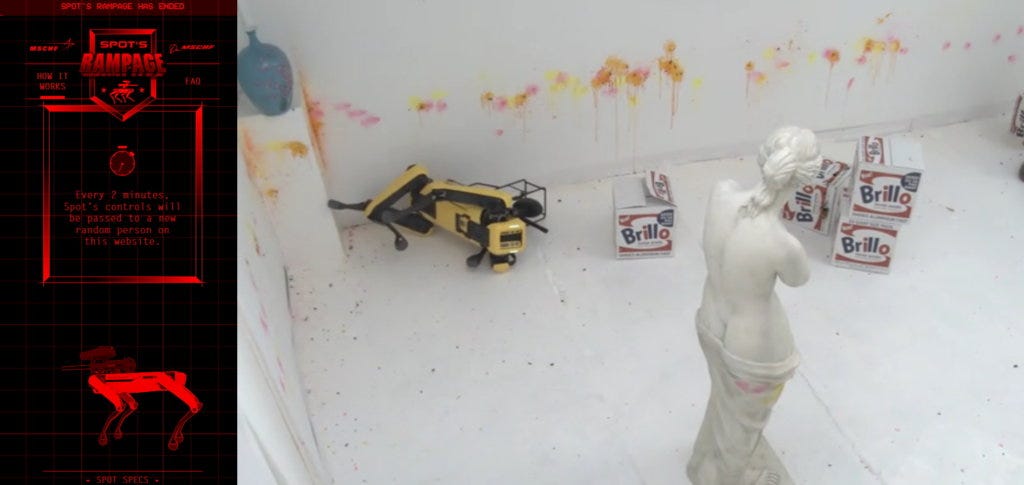 In “Clock, Fall,” a (highly recommended and engaging) keynote lecture at Harvard’s MetaLab, Sydney Skybetter discusses the entangled history of dance, AI, and robotics. Skybetter describes a project from the artist group, MSCHF, called Spot’s Rampage, in which a Boston Dynamics robot with a paint gun is placed inside a mock-up of an art gallery, full of faux Warhol’s and marble sculptures, which are controlled by internet users who can destroy the gallery’s content via livestream.