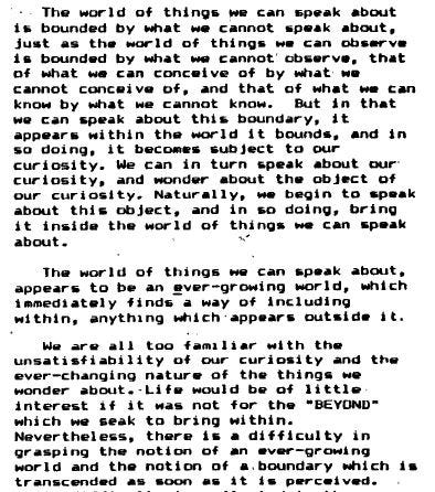“The world of things we can speak about is bounded by what we cannot speak about, just as the world of things we can observe is bounded by what we cannot observe., that of what we can conceive of by what we cannot conceive of, and that of what we can know by what we cannot know. But in that we can speak about this boundary, it appears within the world it bounds, and in so doing, it becomes subject to our curiosity. We can in turn speak about our curiosity, and wonder about the object of our curiosity. Naturally, we begin to speak about this object, and in so doing, bring it inside the world of things we can speak about.