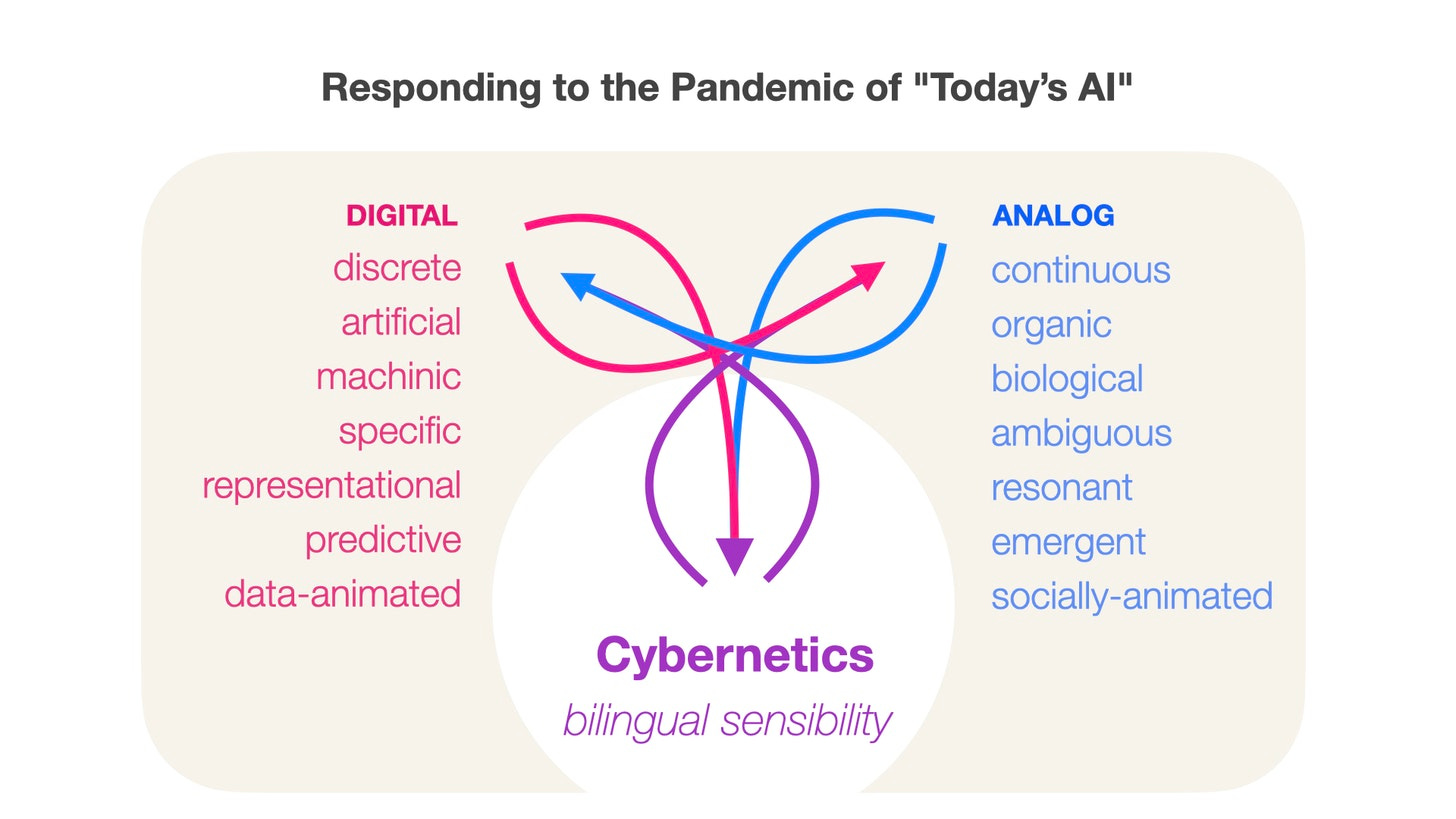 In previous newsletters I’ve written about Paul Pangaro’s “Pandemic of Today’s AI,” a framework for understanding a series of tensions that exist between digital and analog frameworks, or, less pointedly, between socially animated and data animated design. Paul has been introducing the New Macy sessions with some version of this illustration, which I’ve referenced before.