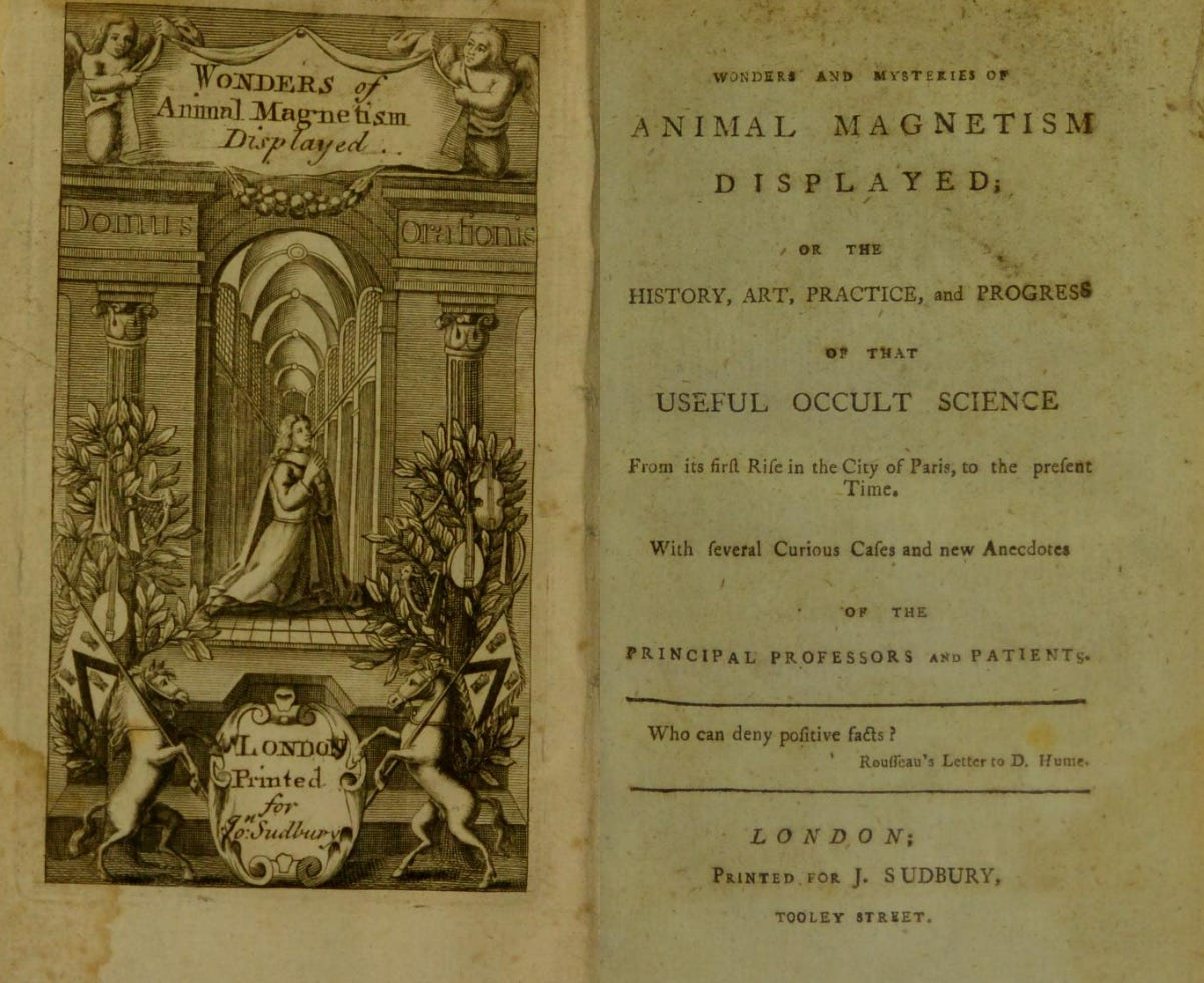 You had Franz Mesmer, theorizing on electricity as a “magnetic fluid,” a matter “which occupies all space; and that as all bodies moving in the world, abound with pores, this fluid matter introduces itself through the interstices and returns backwards and forwards, flowing through one body by the currents which issue therefrom to another, as in a magnet.” Mesmer (who also gave us “mesmerizing”) would use this idea of permeating electrical forces to advance the cause of electroshock therapy.