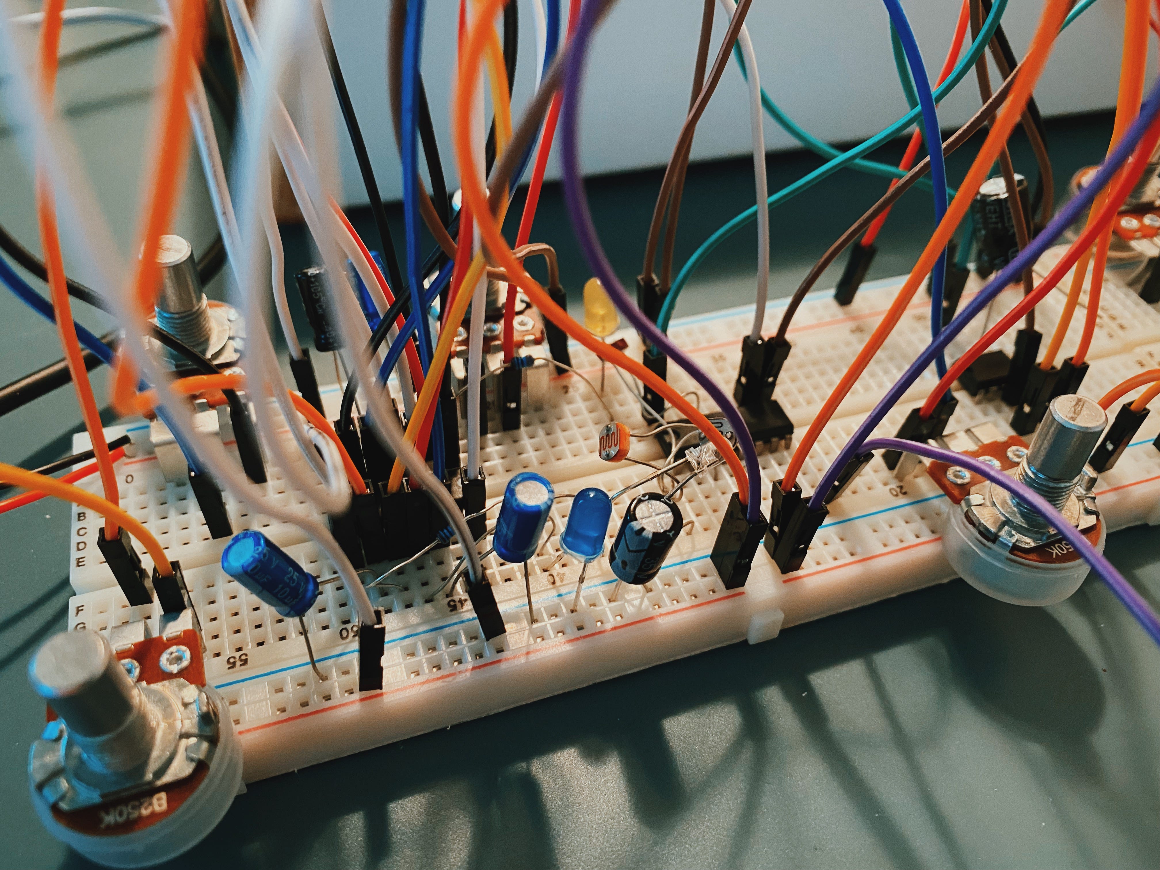 In the photo above you’re seeing a maze for current. A 9V battery sends power moving through a conductive surface beneath that white plastic board. The wires move that energy to specific pieces of the board. The blue things are capacitors, which are like buckets — the current moves into them until it can’t hold them anymore, and then they all shoot out again, giving us rising and falling signals. The knobs you see there are potentiometers. Twist them, and you loosen a wire inside them, extending the length needed to travel through them, slowing the pulse of a wave: longer waves vibrate the speaker’s magnet more slowly than short waves. Slow movement is lower frequency (bass); fast movement is treble, or higher frequencies.