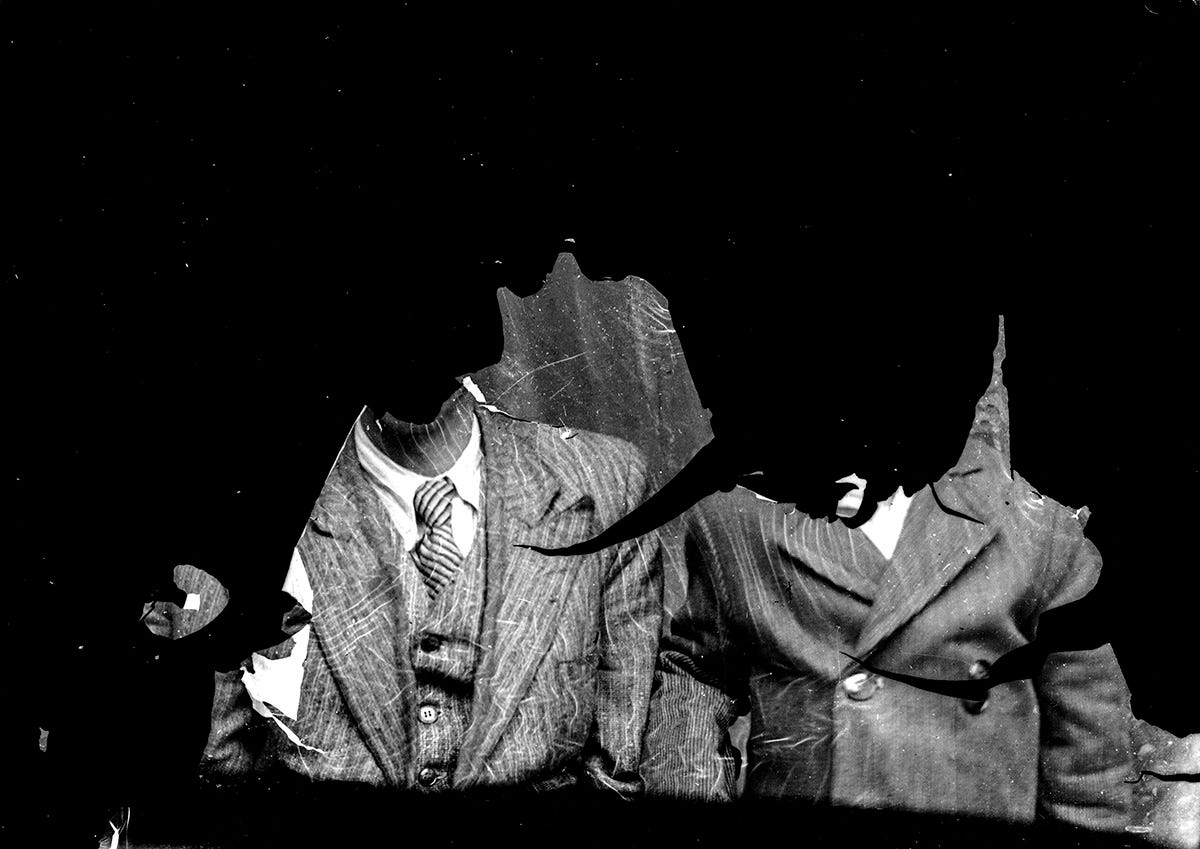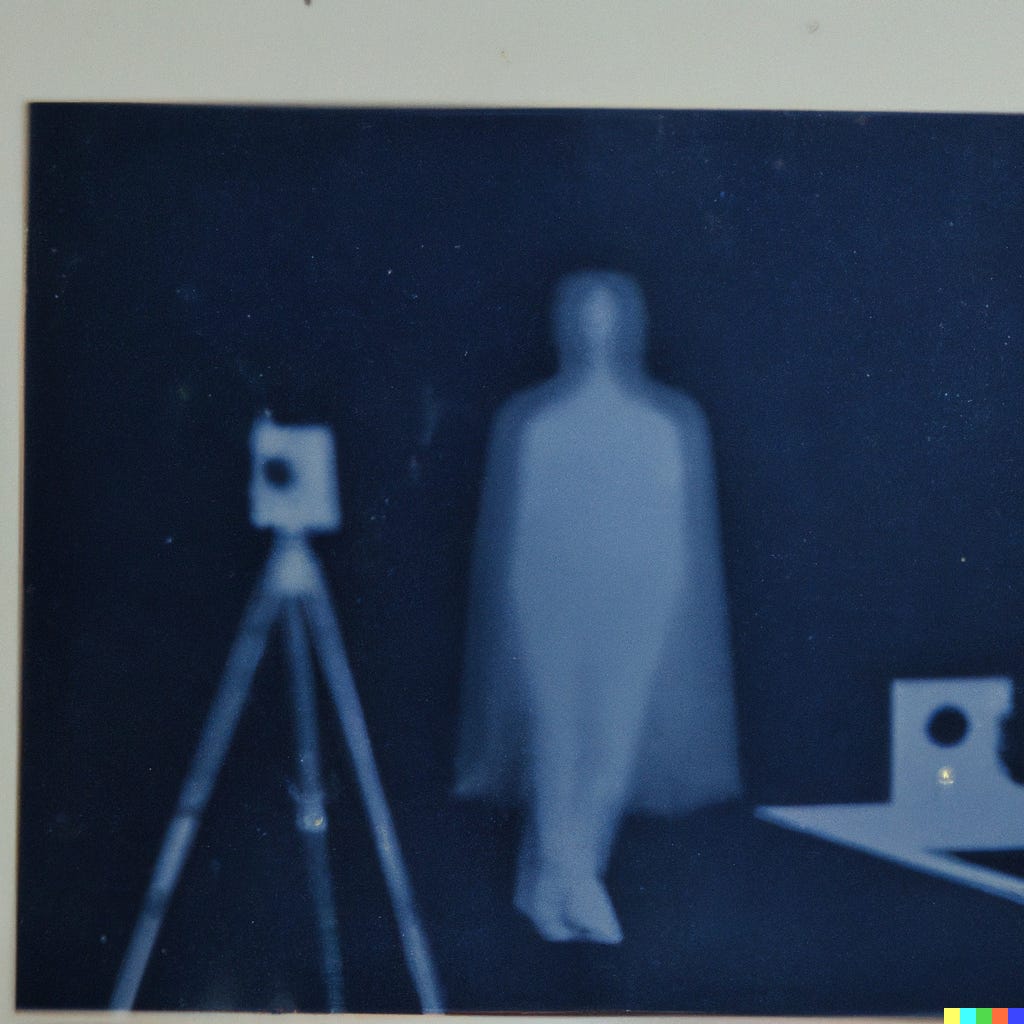 AI generated images are a kind of spirit photography. Spiritualists of the 19th century hoped to scope an apparition through new technologies. Seeking ghosts in our film photographs reflects a relatable mysticism associated with new machines. Seizing opportunity, certain photographers would prep their film spools by taking pictures of a mock specter on a frame of film ahead of the portrait session. When the sitter arrived, their image would be superimposed on the pre-existing image of the staged ghost.