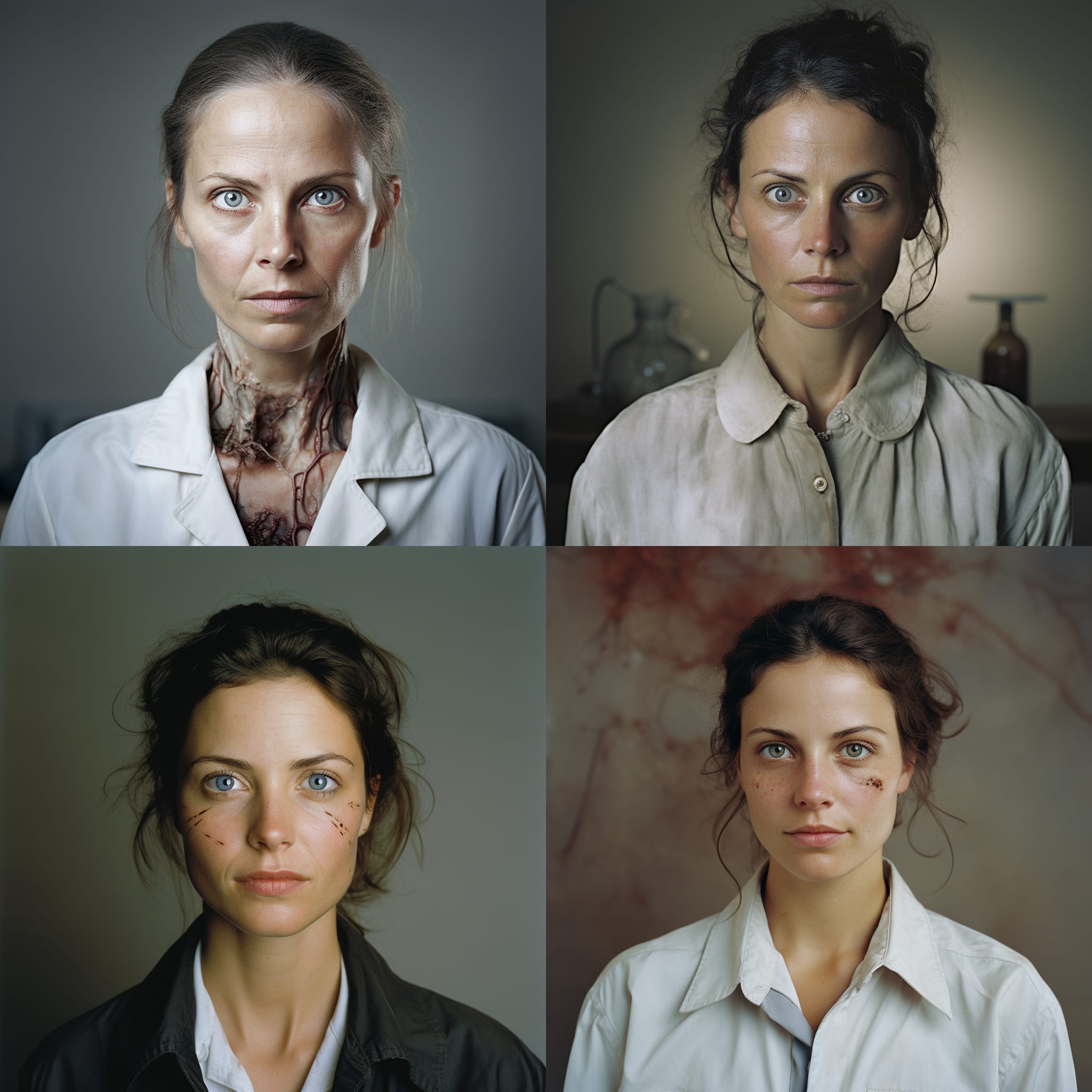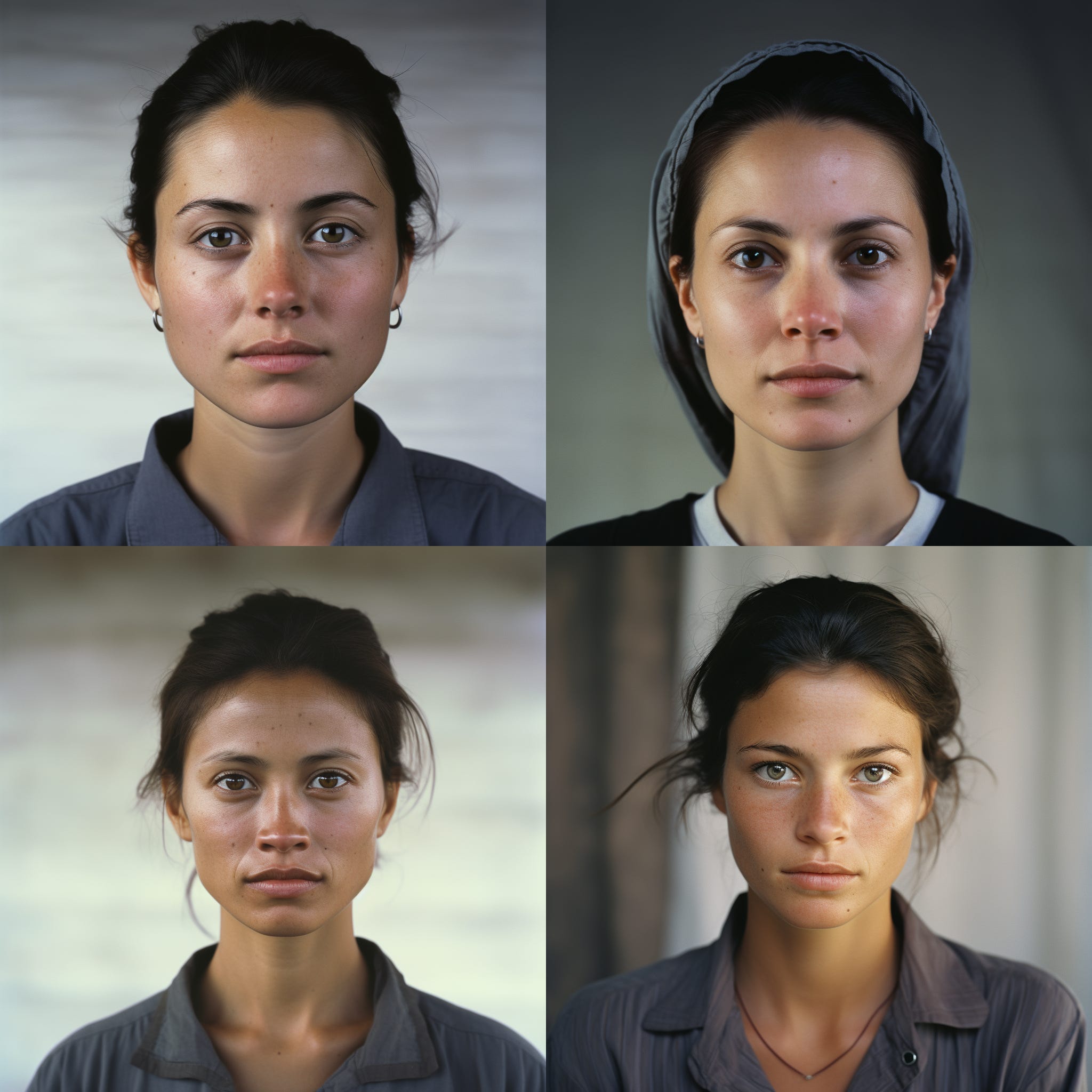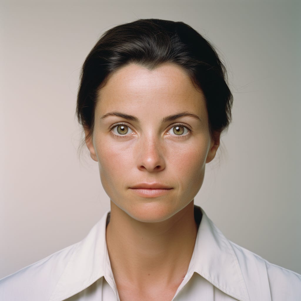 The first image is a baseline: I asked Midjourney to include zero style information, to create a blank expression, and a plain background. The woman is traditionally beautiful, as are most GAI faces, because composites tend to remove asymmetries that we find unappealing.