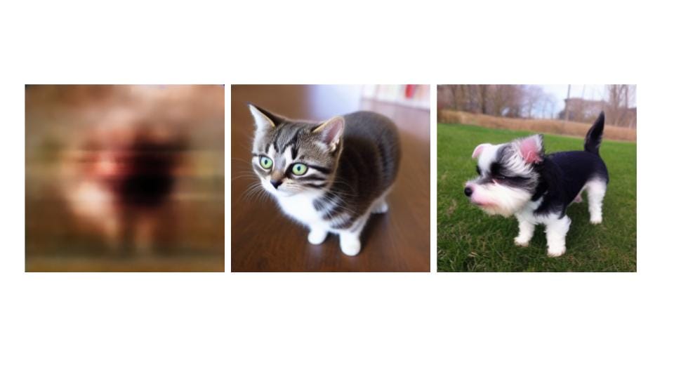 This, I suggest, is a misread of what the vector space does. The vector space constrains the infinite possibilities of noise because infinite possibilities look like noise but don't look like images. So, we're constraining noise to the patterns of previous images in the dataset to conform to that data. Those patterns must be read as plausible images by CLIP. Plausibility comes from grafting the patterns of cats onto a blur or grafting the pattern of a dog onto that blur.