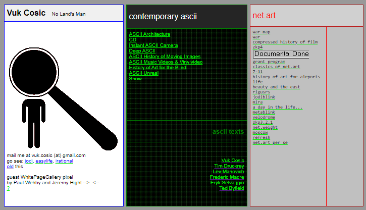 I also don’t want to overemphasize it. The people I was talking to did things like publish essays and exhibit work. I never did any of that. I had no idea how to do any of that. I didn’t believe I needed to. I thought the Web was going to replace art institutions! So much so that there was a piece created when I was part of a Belgian artist collective called dBonanzah! — we bought the still-unregistered domain names of major art institutions in Belgium, designed websites for them, and then listed exhibitions of internet artists. A genuine art world disinformation campaign.