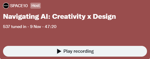 If you’d like to listen to my conversation about AI, creativity & design with author and artist Carla Diana and SPACE10’s Alexandra Zenner and Ryan Sherman, you can find the recording through the button above or below (even if you don’t have a Twitter account!). We touched all sorts of ideas about AI’s creative space and the creative space’s response to AI.