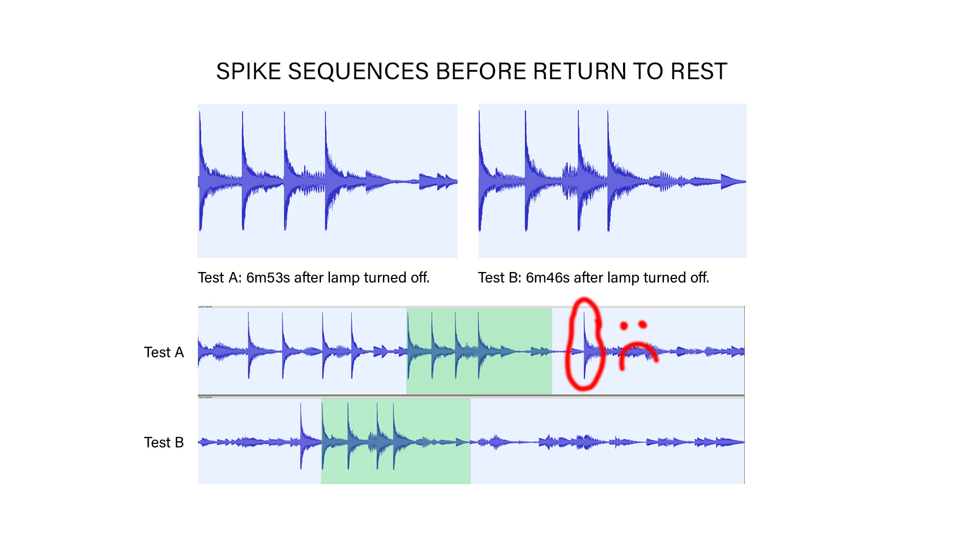 The sequence that occurred just before the return to rest were quite similar. There was a stray spike in Test A, but after that final shot of voltage the mushroom was silent for the remainder of the recording.