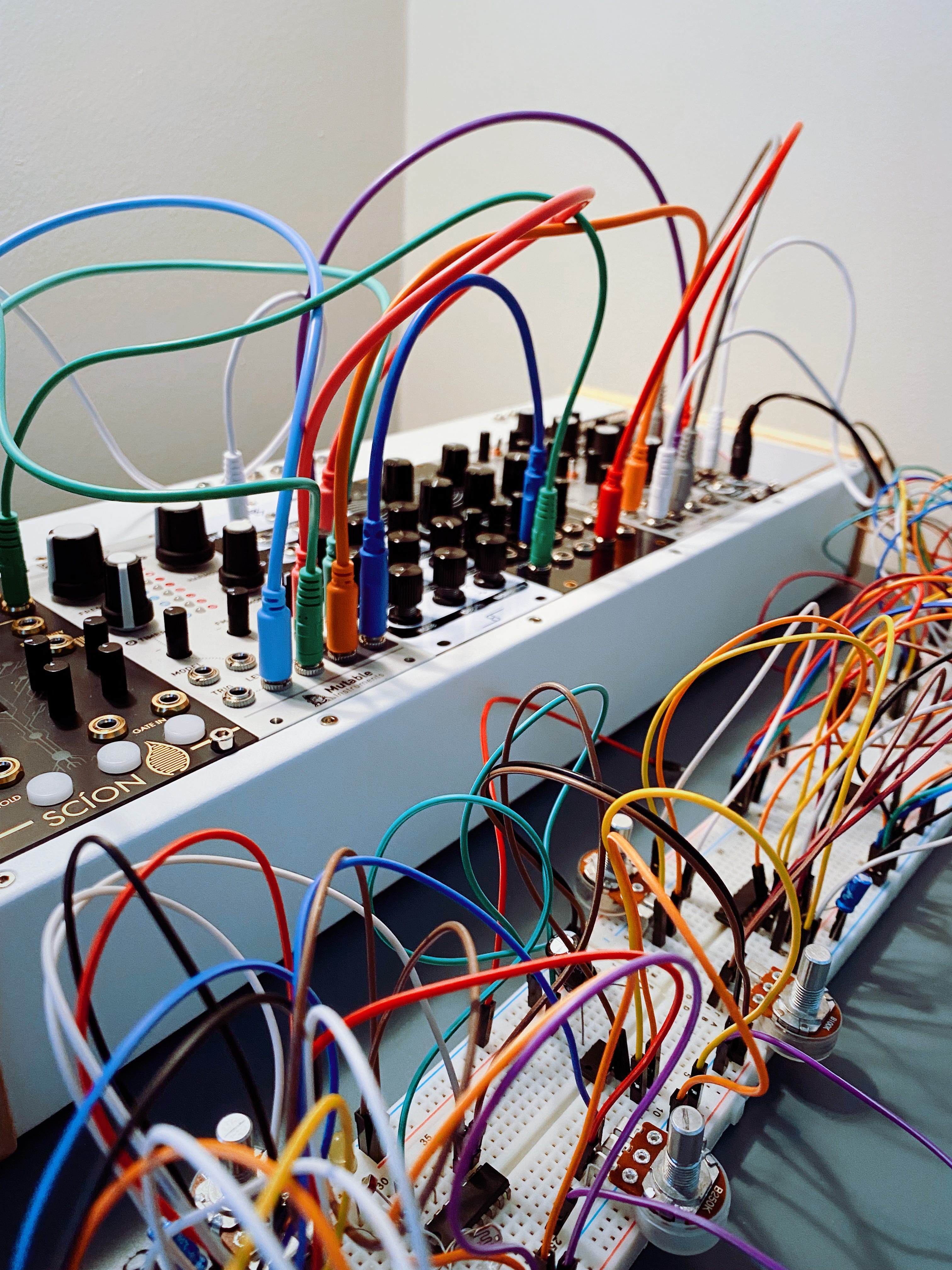 First, some clarity on what a modular synthesizer is. For those who aren’t familiar, it’s a synthesizer with no keyboard. The music is produced by moving electricity between modules. There are some knobs to adjust the speed and structure of that electric signal, but generally, my goal is not to touch them. All of them have holes in them that can either take or send voltage through the colorful wires you see pictured.