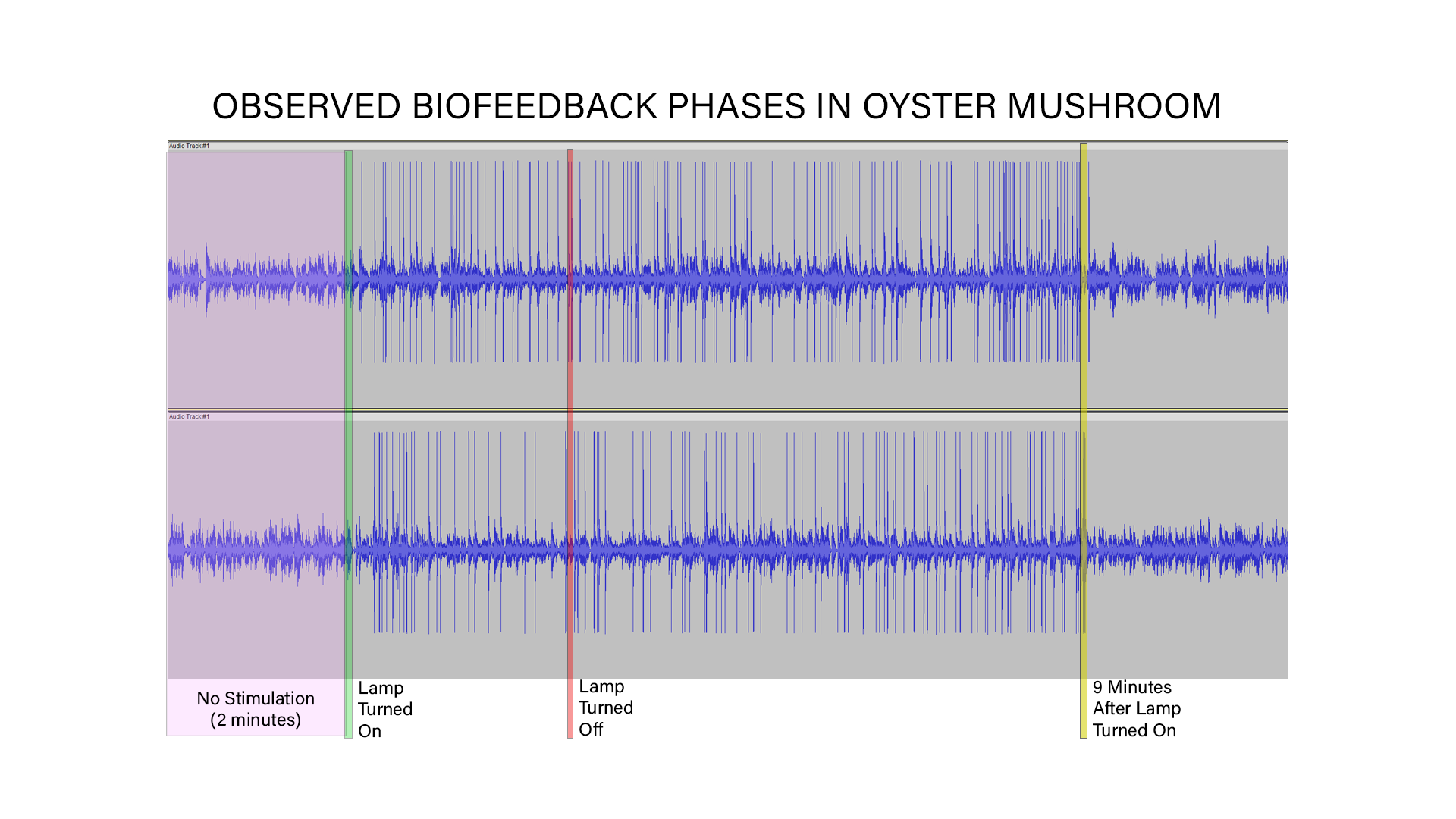 The mushroom can sense, this is obvious. It moves, it grows toward food and light, aims to get away from excessive heat. We can hypothesize that the light activation from the “heat” signal in the mushroom began sending spikes to signal a retreat away from the blazing desk lamp. This is what mushrooms do.