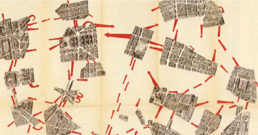 “The production of psychogeographical maps, or even the introduction of alterations such as more or less arbitrarily transposing maps of two different regions, can contribute to clarifying certain wanderings that express not subordination to randomness, but total insubordination to habitual influences.” (1955)