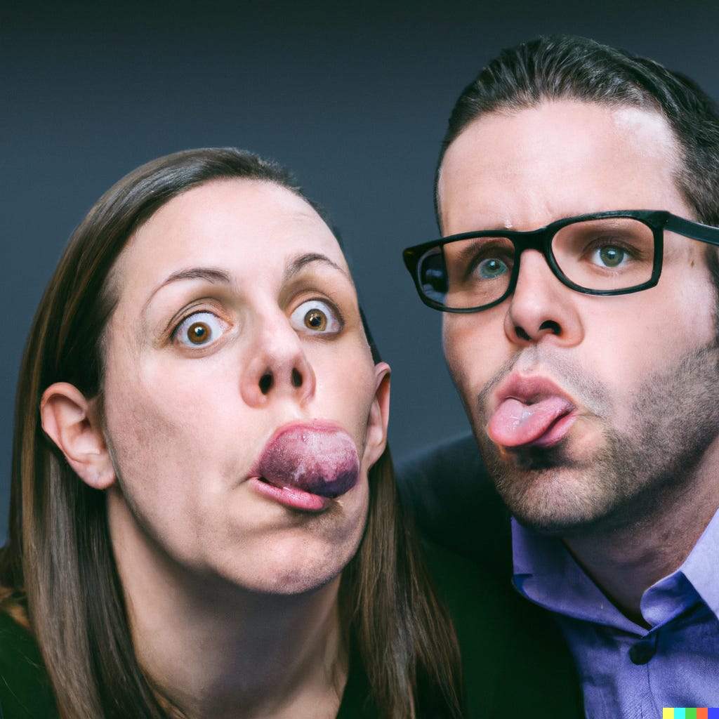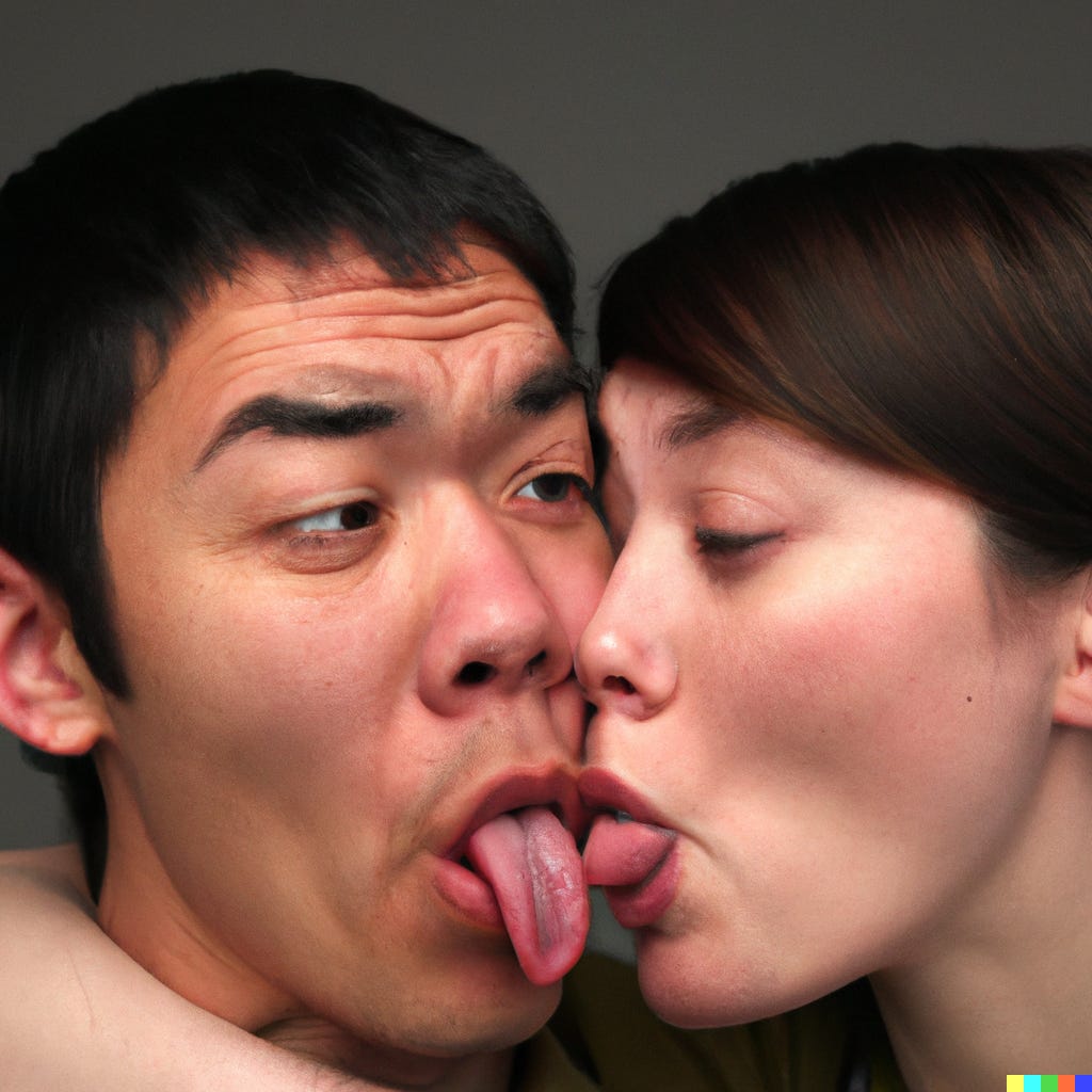 The theory was that DALLE2 would understand humans kissing and frog tongues, consider them different categories, and then render images where it attempted to reconcile a tongue with the human images. I expected some frog tongues would come through in the results. I also wondered if the treatment of the tongue as “frog tongues” would allow the tongue to be displayed in ways that they could not be if they were treated as “human.”