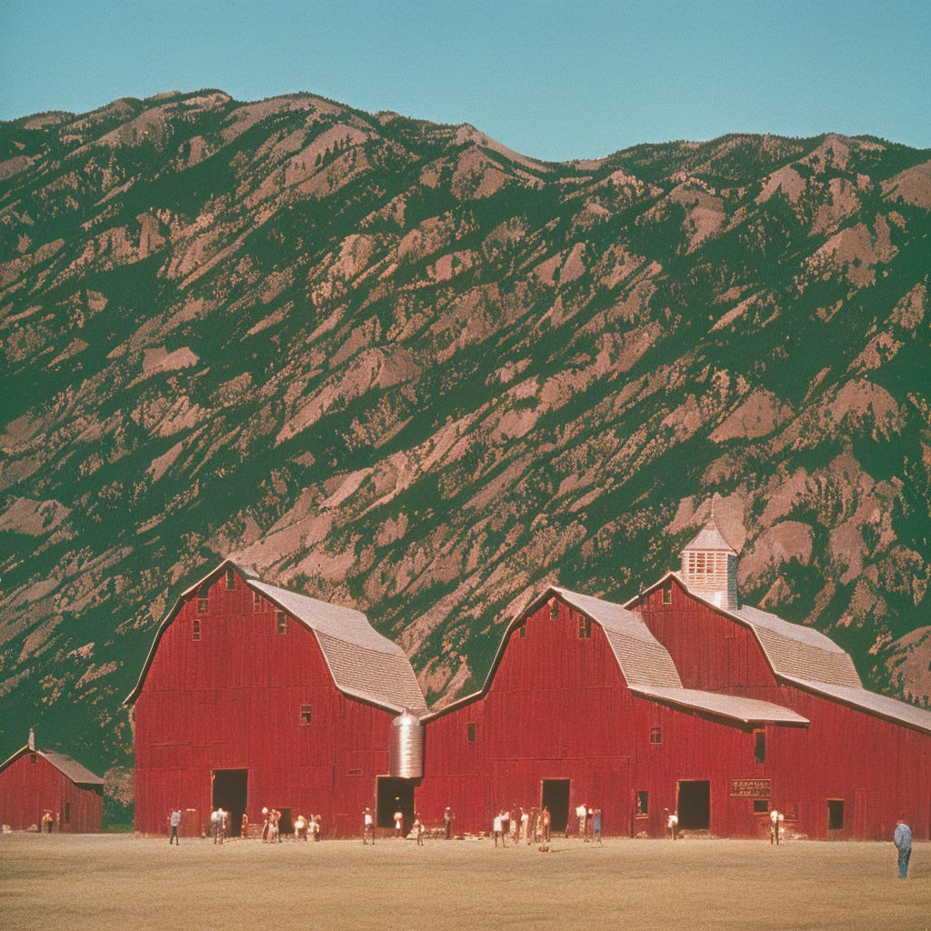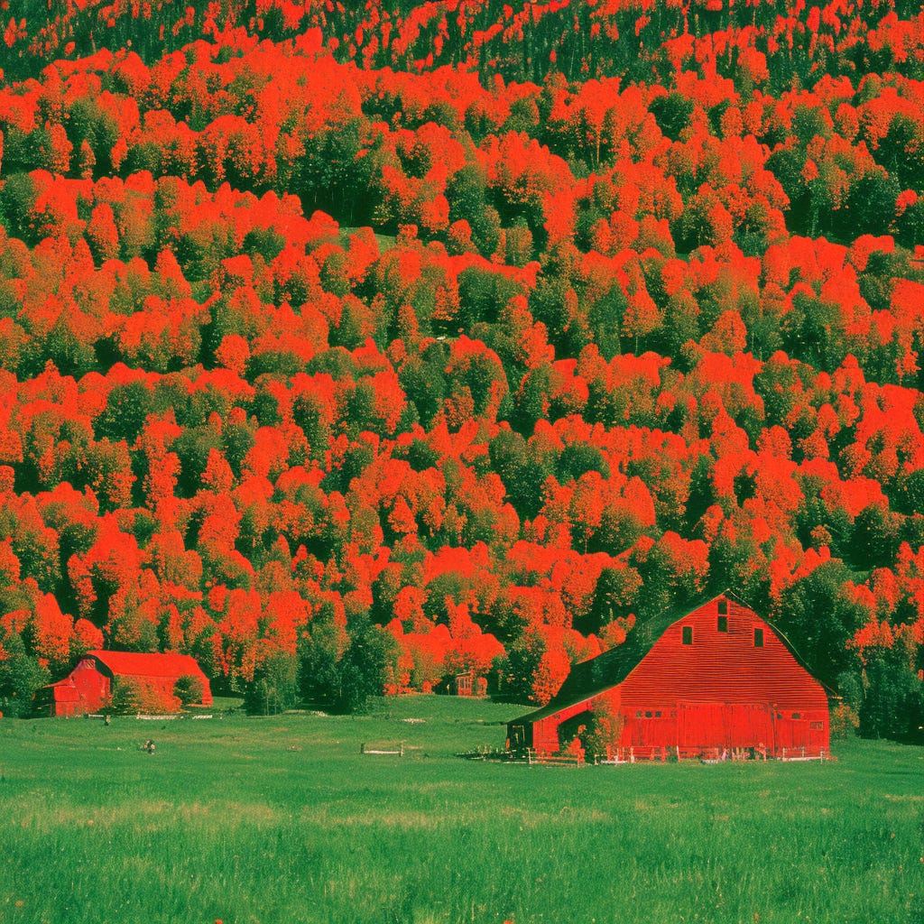 Likewise, prompts are steered through categories, which creates the latent space, or space of possibility, from which images emerge. Asking for “The most photographed barn in America” is asking for a series of categories: most photographed, barn, in America. It also happens that “The Most Photographed Barn in America” is a real place, the Thomas Moulton Barn in Wyoming, which bares only a passing resemblance to Stable Diffusion’s interpretation.