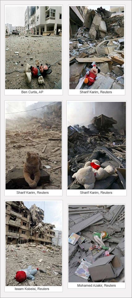 In 2006, AP photographer Ben Curtis in 2006 took a photo of a Mickey Mouse doll laying on the ground in front an apartment building that had been blown up during Israel’s war against Hezbollah in Lebanon.