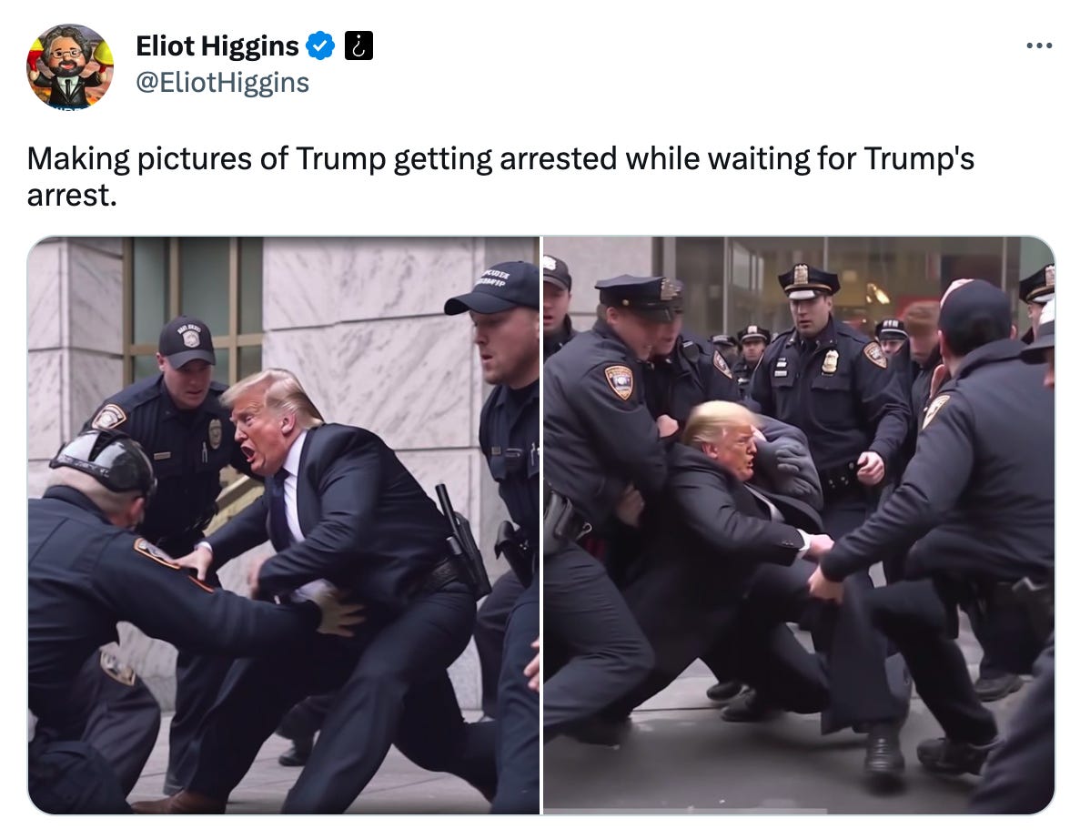 It would be a mistake to treat synthetic images in isolation from their distribution channels. The famous AI photo of Donald Trump’s arrest is false information, a false depiction of a false event. The Trump images were shared with full transparency. As it moved through the network, noise was introduced: the caption was removed.