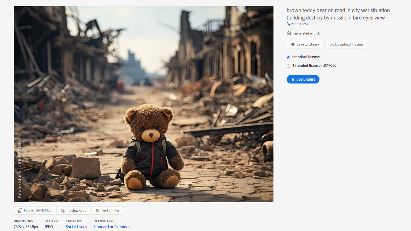 Today, similar imagery is being sold related to Gaza. This image of a teddy bear on the streets of a bombed city is presented when you search Adobe Stock photographs for pictures of Palestinians.