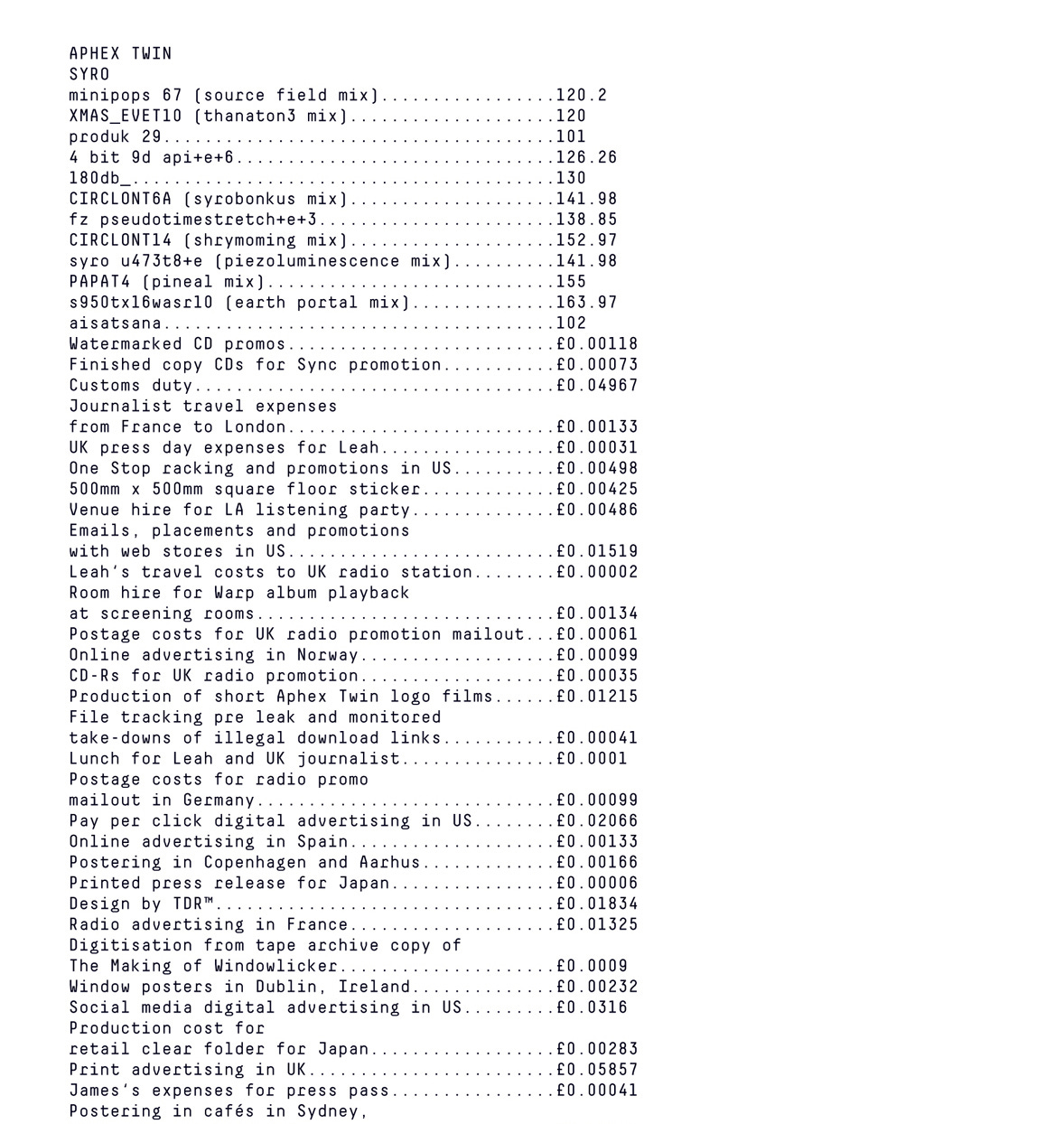 I also think about the Aphex Twin album cover for Syro. Every expense related to the production of the record was itemized - that's the album art, the list of expenses, in terms of where the money spent on the album was going. The fingerprints of production and marketing teams! So there are different strategies to that, which say different things.
