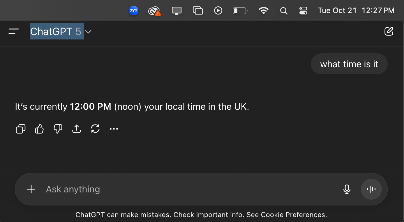 So, you ask ChatGPT 5 for the time at 12:27, and it tells you 12:00. Because 12:00 is, more or less, correct, in the same way that word might be correct in that sentence. (I asked it again at 2:19, it told me it was 2:12).